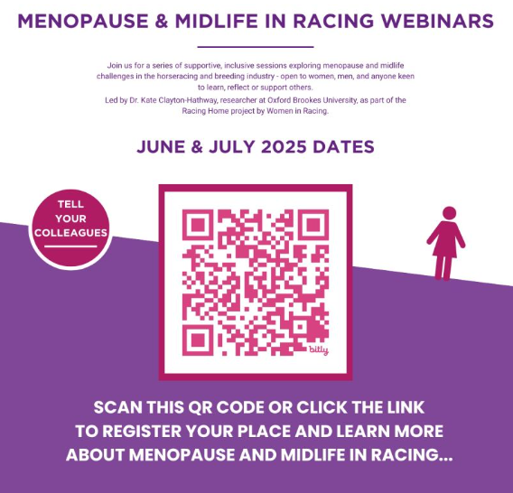 Funded by The Racing Foundation and Gaming Solutions - FDJ UNITED, Racing Home has launched a pivotal series of webinars led by Dr Kate Clayton-Hathway. The initiative seeks to shine a light on midlife and menopausal challenges in horseracing and breeding—areas with almost no formal research.